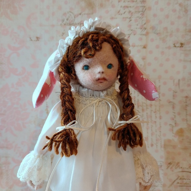 うさぎ帽子を被った 手のひらサイズの 小さな女の子。 羊毛をチクチクして 顔を作っています。 しっぽがチャームポイント。 首が動き、 顔の向きが変わります。 使用素材:羊毛・コットン ファー・リボン・レース糸 くるみボタン・重り 高さ 11 cm 発送は日本国内にのみ対応します。