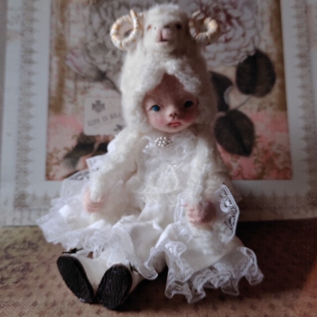羊毛を素材にお人形を作っているので 羊モチーフのものを作りたいと思い 作りました「羊?」です。 同じテーマで作り続けて 35体目です。 同じものは作れないので 一期一会で気に入って頂けましたら 嬉しいです。 どうぞよろしくお願いします。 羊毛を丁寧にチクチクして 顔を作っています。 布で作られたボディは、 自立はしませんが、 首、足、膝が可動し、 座らせて飾ることができます。 こちらは 着替え不可です。 ワンピースの裾を 小さなビーズで飾っています。 羊毛のお顔は摩れや 引っ張りには弱いので お子さま用のお人形には 不向きです。 お人形データ 人形本体22.5cm 羊頭部含め25.5cm 羊毛頭部・帆布ボディ 手足スムースニット 使用素材 : 羊毛頭部・帆布ボディ 木毛・手足スムースニット 毛糸・レース糸・レース コットン生地・ボタン・リボン 布フェルト・革・ビーズ 粘土・和紙・アクリル絵の具・ニス