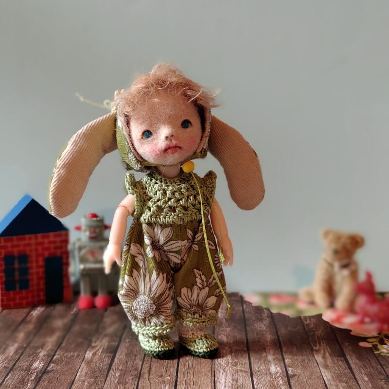 洋服はコーデュロイ生地とレース編み。